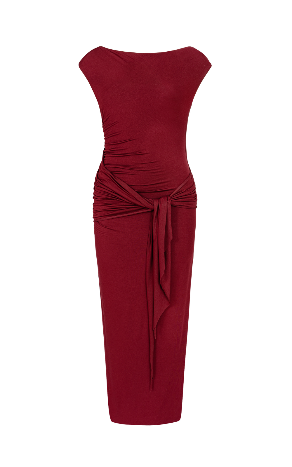 Dopasowana sukienka maxi z wiązaniem – czarna i bordowa.