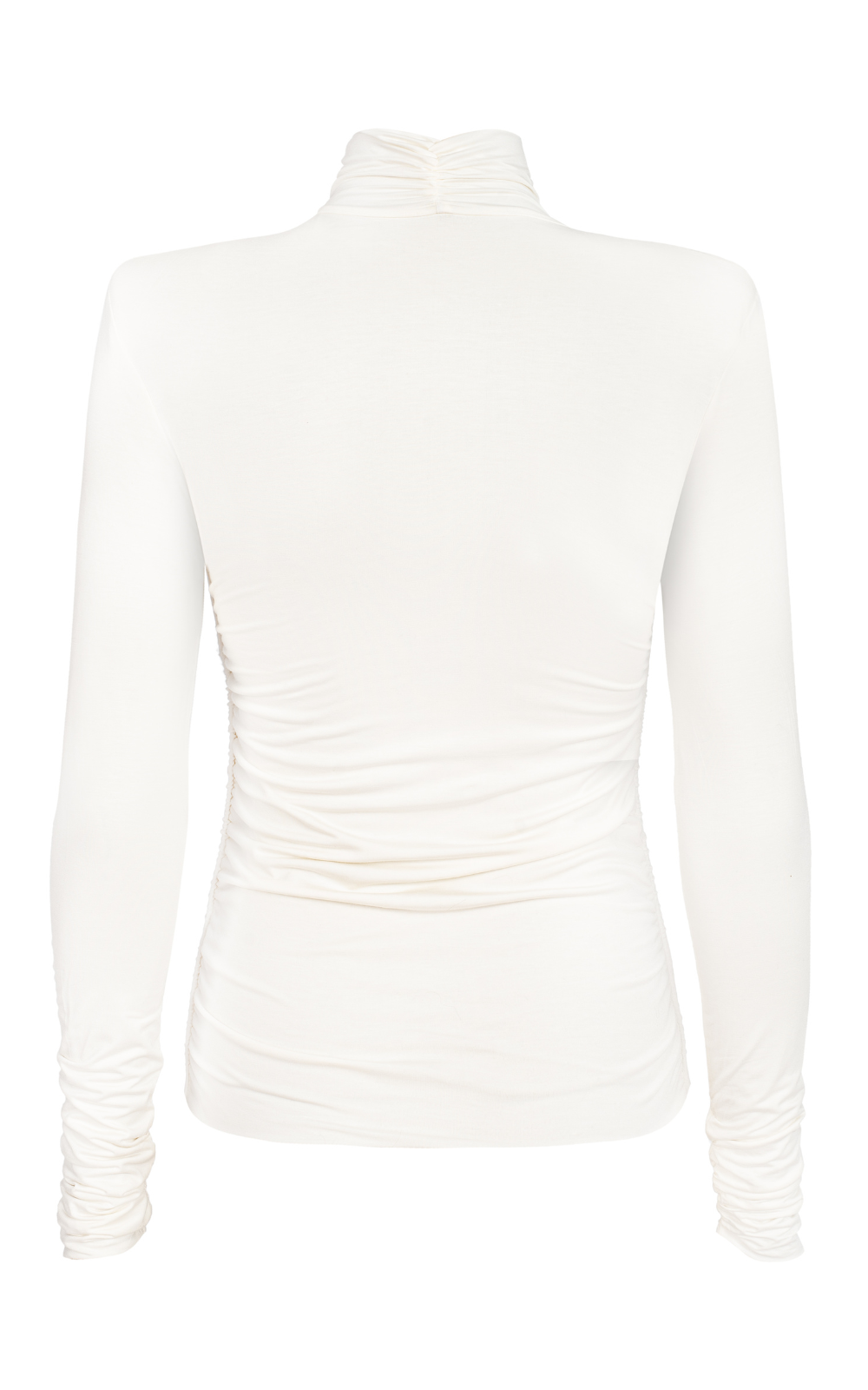 - Wykonana z miłego w dotyku modalu, bluzka subtelnie podkreśla sylwetkę dzięki delikatnym marszczeniom na golfie, po bokach oraz na ramieniu.