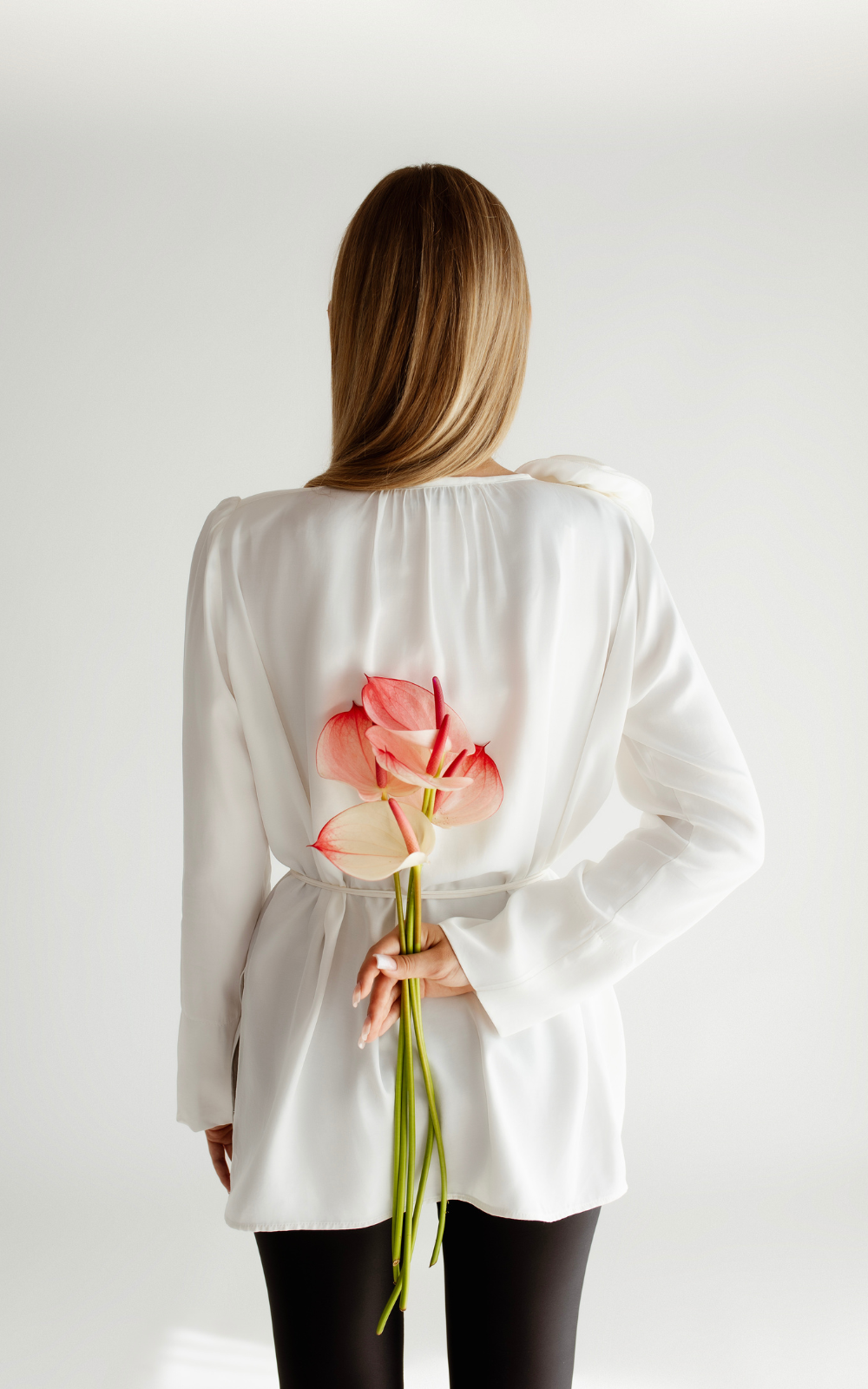 Dodatkowym atutem koszuli jest sznurek oraz odpinana broszka w kształcie kwiatu, które znajdziesz w zestawie.