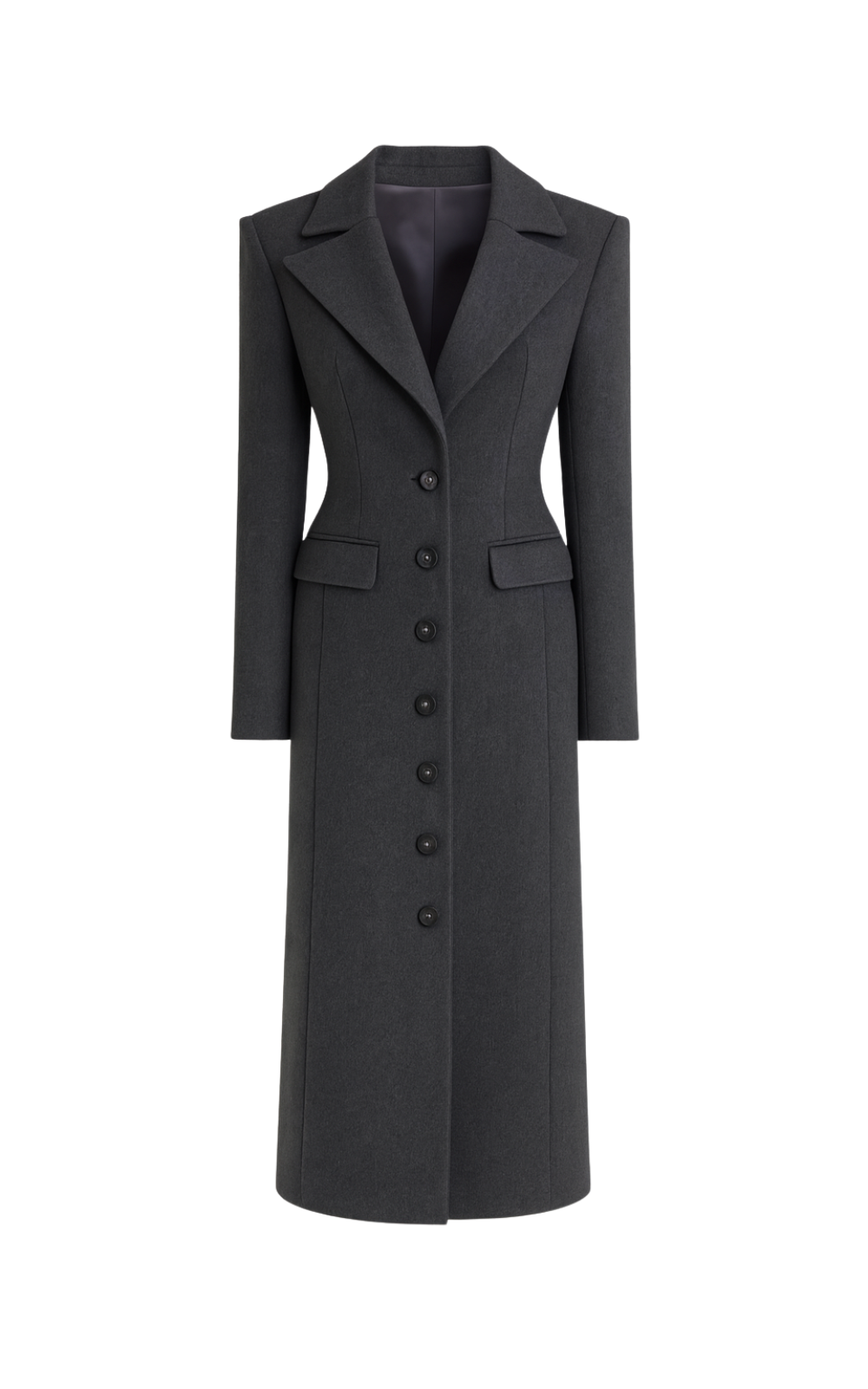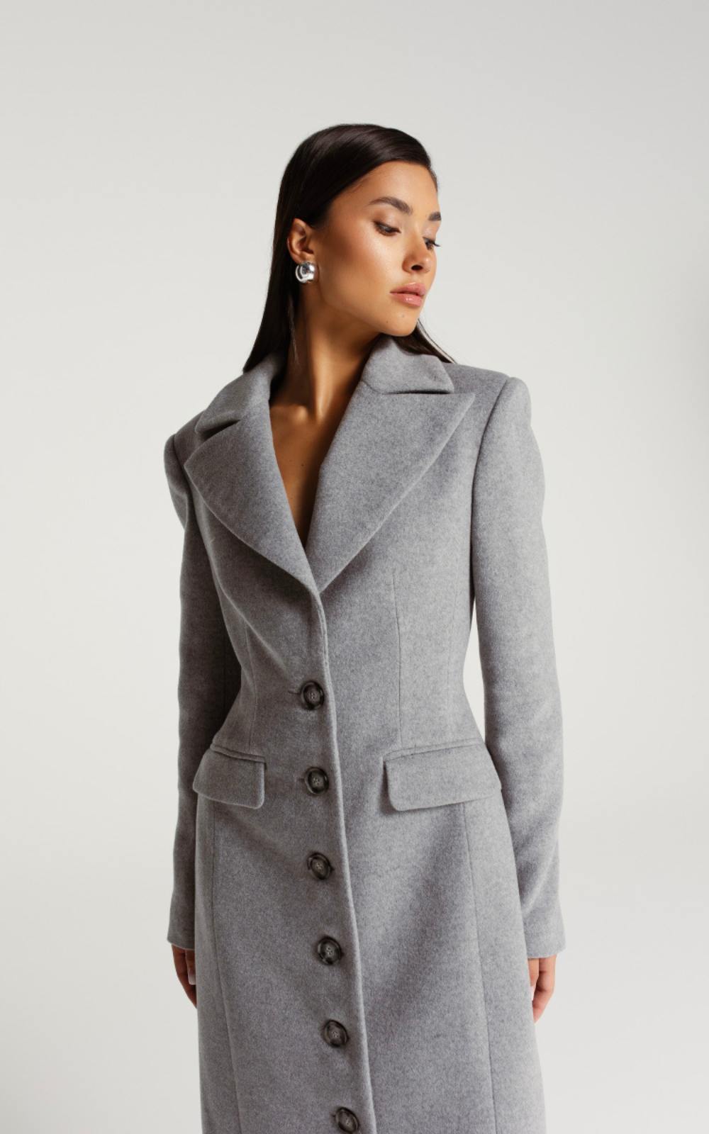 • Kwintesencja elegancji i nowoczesnej formy. Długi, dopasowany płaszcz o perfekcyjnie skrojonej sylwetce podkreśla figurę i wysmukla talię.