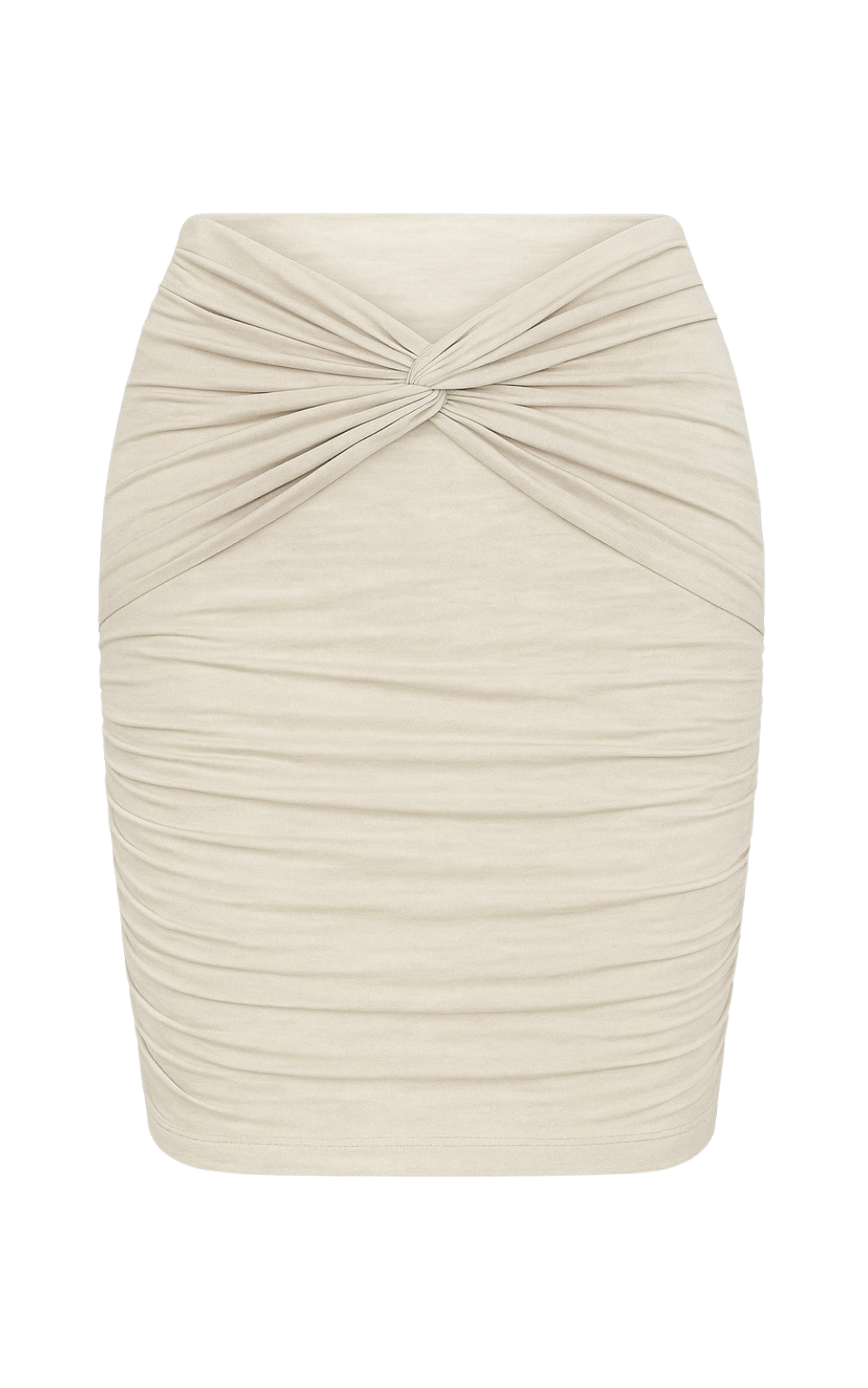 •    dzianinowa spódnica mini w odcieniu taupe,