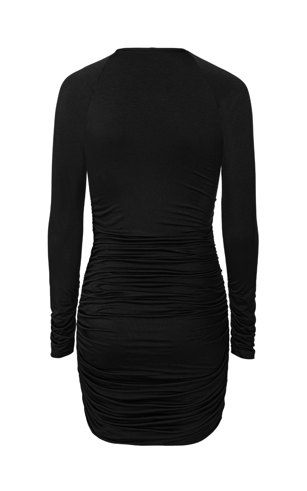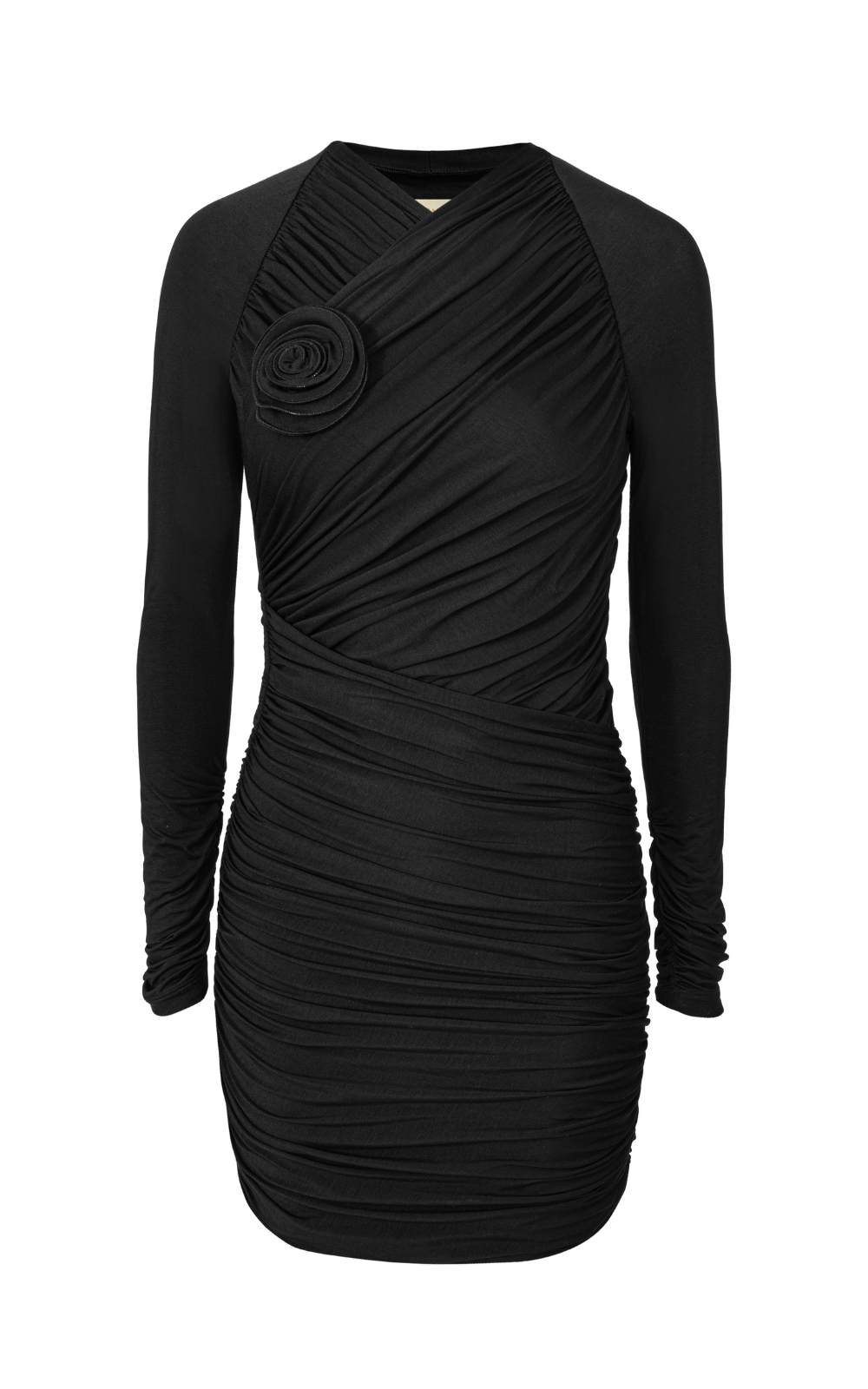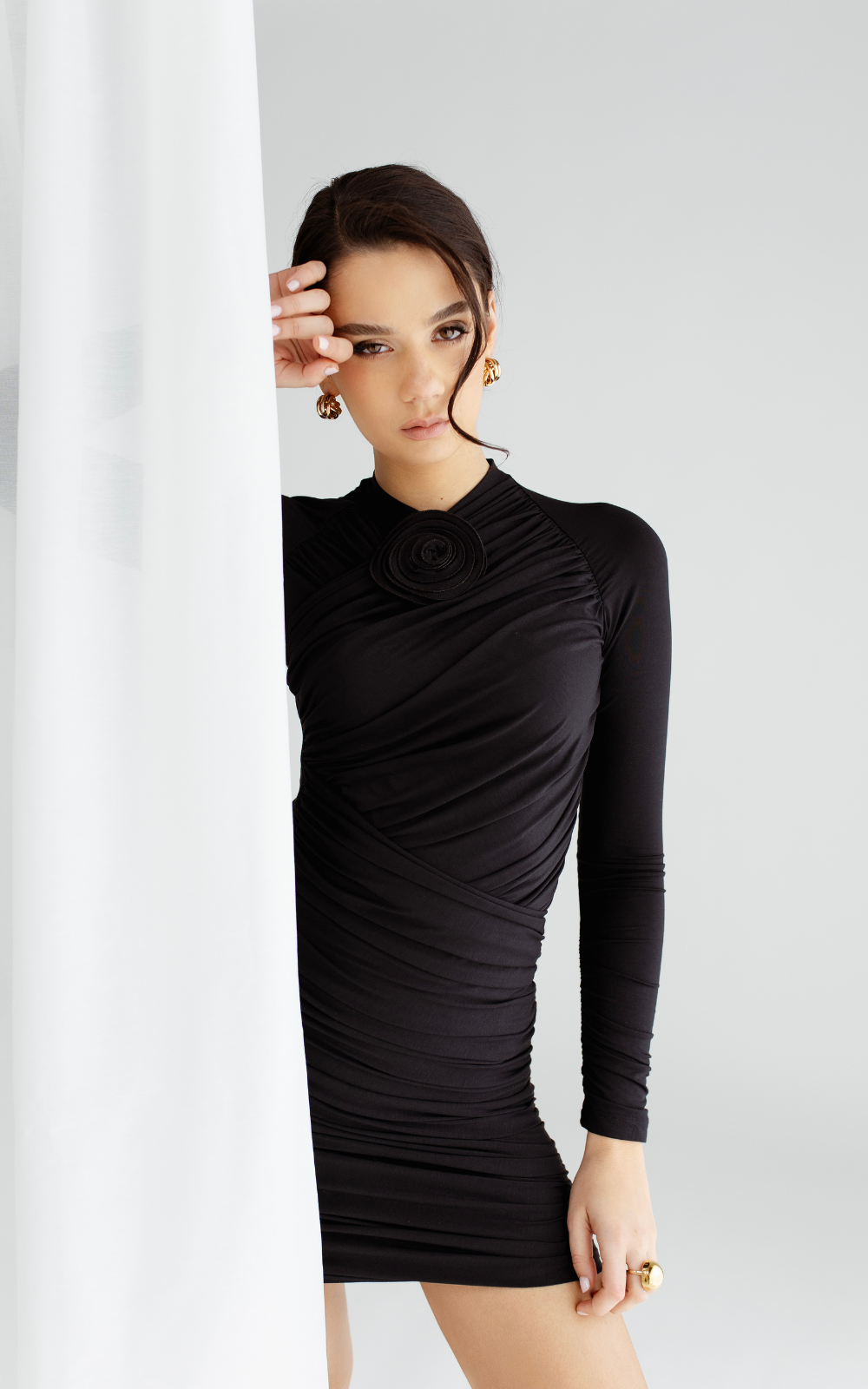 - Długi rękaw i zabudowany kopertowy dekolt tworzą zrównoważoną, minimalistyczną konstrukcję, która doskonale kontrastuje z marszczonym dołem sukienki.
