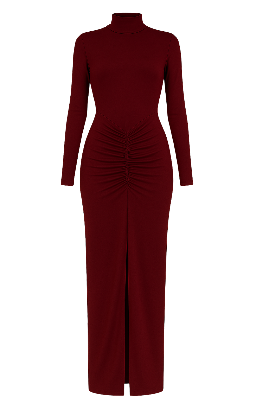 • Dopasowana sukienka maxi, uszyta z elastycznego mikromodalu. Łączy klasę z kobiecością. Dopasowany krój z marszczeniem w talii podkreśla sylwetkę, a golf i długi rękaw nadają jej elegancji.