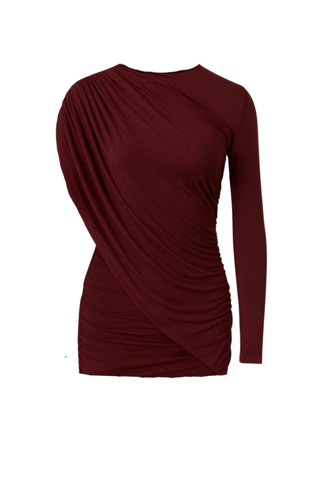 Elegancka mini sukienka wykonana z podwójnej warstwy elastycznego mikromodalu, który zapewnia idealne dopasowanie i wysoki komfort noszenia. Charakterystycznym elementem modelu jest asymetryczny krój bez jednego rękawa oraz luźna, efektownie drapowana szarfa, marszczona i poprowadzona wzdłuż jednego boku, tworząca subtelny efekt opływających linii.