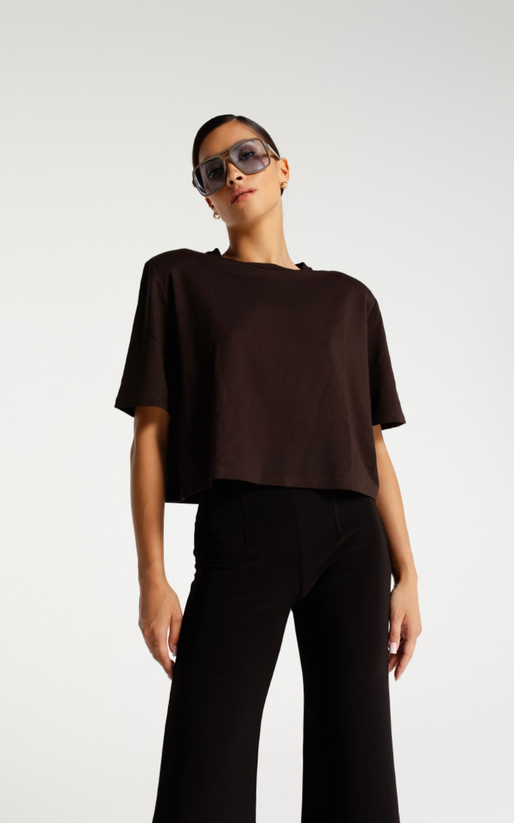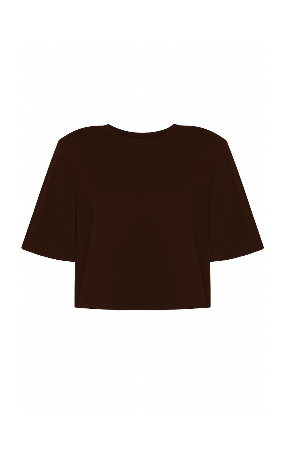 Dzięki poduszkom na ramionach, koszulka zyskuje wyrazistą formę i podkreśla sylwetkę, dodając stylizacji charakteru. Uszyta z wysokogatunkowej dzianiny bawełnianej, jest miękka w dotyku, oddychająca i przyjazna dla skóry.